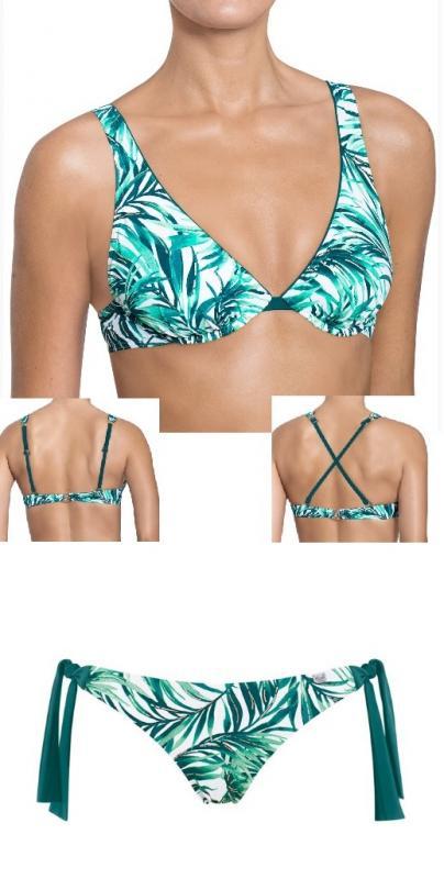 Costum de baie din 2 piese: sutien cu armatura si cupe usoare din materialul costumului de baie, fara captuseala. Maerialul are proprietatea de uscare rapida. Bretelele se inchid la spate clasic sau in X. Slipul are croiala pe jumatate de poponet la spate si este ajustabil in ambele laterale.