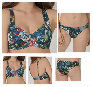 Cotum de baie din 2 piese: sutien cu armatura si cupe simple din materialul costumului de baie, fara burete sau captuseala. Croiala si taieturile sunt create pentru a asigura sustinere si o asezare perfecta pe san indiferent de marimea circumferintei sau a cupei. Slipul are croiala clasica la spate si talie semijoasa.