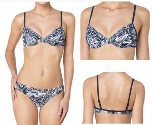 Costum de baie din 2 piese, material cu proprietatea de uscare rapida. Sutienul are armatura si cupele simple, din materialul costumului de baie, fara nici un fel de captuseala. Slipul are talie semijoasa si croiala clasica la spate.