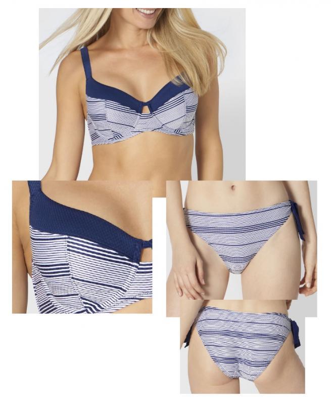 Costum de baie din 2 piese: sutien cu armatura si cupe simple fara captuseala sau burete. Sustinerea este una foarte buna pana la cupe si circumferinte mari si este realizata de armatura si de cusaturile date de croiala cupei. Slipul este clasic, funditele din lateral sunt decorative.