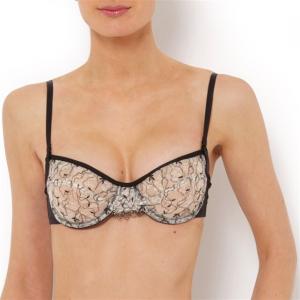 Sutien Triumph, cu armatura, fara cupe captusite din dantela intr-o minunata combinatie de alb si negru.